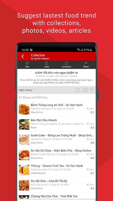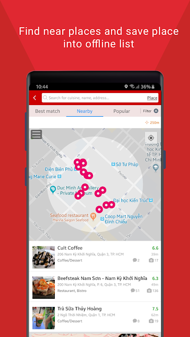 The application to "search" and "review" food locations in most of the provinces and cities in Vietnam such as Ho Chi Minh City, Hanoi, Da Nang, Hai Phong, Nha Trang....